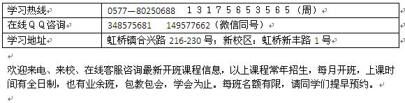 学习热线:0577—80250688 13175653565(周);在线QQ咨询:348575681微信同号;学习地址 虹桥镇合兴路216-230号;新校区:虹桥新丰路1号欢迎来电、来校、在线客服咨询最新开班课程信息,以上课程常年招生,每月开班,上课时间有全日制,也有业余班,包教包会,学会为止。每班名额有限,请同学们提早预约。...