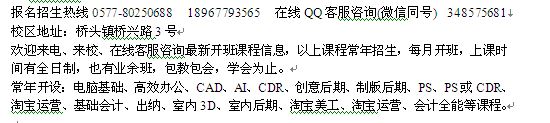 常年开设:电脑基础、高效办公、CAD、AI、CDR、创意后期、制版后期、PS、PS或CDR、淘宝运营、基础会计、出纳、室内3D、室内后期、淘宝美工、淘宝运营、会计全能等课程www.xbaixing.com小百姓网。