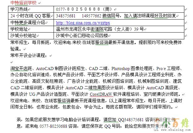 欢迎来电、来校、在线客服咨询最新开班课程信息,以上课程常年招生,每月开班,上课时间有全日制,也有业余班,包教包会,学会为止。每班名额有限,请同学们提早预约x+b+a+i+x+i+n+g+c+o+m。
