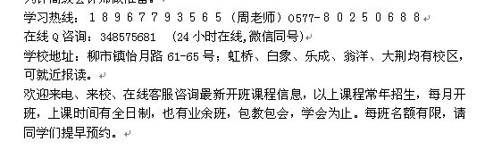 学习热线:0577—80250688 13175653565(周);在线QQ咨询:348575681微信同号;学习地址 虹桥镇合兴路216-230号;新校区:虹桥新丰路1号欢迎来电、来校、在线客服咨询最新开班课程信息,以上课程常年招生,每月开班,上课时间有全日制,也有业余班,包教包会,学会为止。每班名额有限,请同学们提早预约。...
