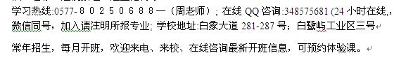 学习热线:0577—80250688 13175653565(周);在线QQ咨询:348575681微信同号;学习地址 虹桥镇合兴路216-230号;新校区:虹桥新丰路1号欢迎来电、来校、在线客服咨询最新开班课程信息,以上课程常年招生,每月开班,上课时间有全日制,也有业余班,包教包会,学会为止。每班名额有限,请同学们提早预约。...