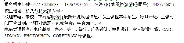 学习热线:0577—80250688 13175653565(周);在线QQ咨询:348575681微信同号;学习地址 虹桥镇合兴路216-230号;新校区:虹桥新丰路1号欢迎来电、来校、在线客服咨询最新开班课程信息,以上课程常年招生,每月开班,上课时间有全日制,也有业余班,包教包会,学会为止。每班名额有限,请同学们提早预约。...