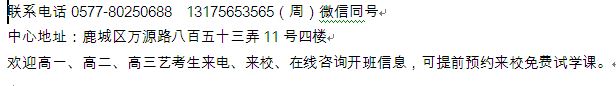 联系电话0577-80250688 13175653565(周)微信同号中心地址:鹿城区万源路八百五十三弄11号四楼欢迎高一、高二、高三艺考生来电、来校、在线咨询开班信息,可提前预约来校免费试学课。...