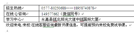 招生热线 0577-80250688——18958740878在线Q咨询 149577662(微信同号)学习中心 永嘉县瓯北阳光大道中瓯国际大厦欢迎来电/来校/在线客服咨询最新开课信息,可提前预约来校免费试学课。...