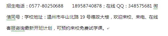 招生电话:0577-80250688 18958740878;在线QQ:348575681微信同号;学校地址:温州市牛山北路19号德政大楼,欢迎来校、来电、在线客服咨询最新开班计划,可预约来校免费试学课小.生.活.网。
