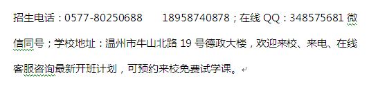 招生电话:0577-80250688 18958740878;在线QQ:348575681微信同号;学校地址:温州市牛山北路19号德政大楼,欢迎来校、来电、在线客服咨询最新开班计划,可预约来校免费试学课来源www.xbaixing.com。