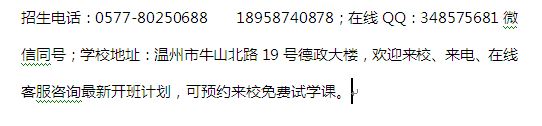 招生电话:0577-80250688 18958740878;在线QQ:348575681微信同号;学校地址:温州市牛山北路19号德政大楼,欢迎来校、来电、在线客服咨询最新开班计划,可预约来校免费试学课。