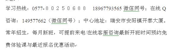 学习热线:0577-80250688 18967793565微信同号;在线Q咨询: 149577662(微信同号);中心地址:瑞安市安阳镇开泰大厦。常年招生,每月新班,可提前来电/在线客服咨询最新开班时间预约免费体验课与最近报名优惠活动