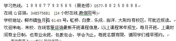 学习热线:0577—80250688 13175653565(周);在线QQ咨询:348575681微信同号;学习地址 虹桥镇合兴路216-230号;新校区:虹桥新丰路1号欢迎来电、来校、在线客服咨询最新开班课程信息,以上课程常年招生,每月开班,上课时间有全日制,也有业余班,包教包会,学会为止。每班名额有限,请同学们提早预约。...