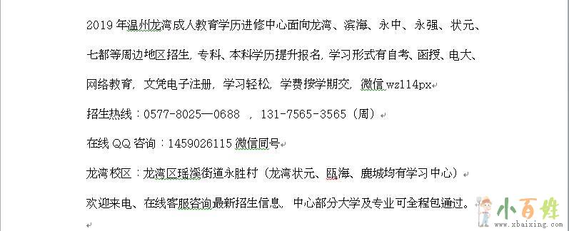 2019年温州龙湾成人教育中心面向龙湾、滨海、永中、永强、状元、七都等周边地区招生,自考、函授、电大、远程教育招生,学制短,考试易过,业余学习,文凭电子注册,国家承认x.b.a.i.x.i.n.g.c.o.m。微信报名wz114px