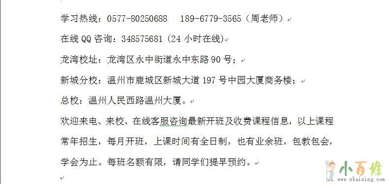 学习热线:0577-80250688 189-6779-3565(周老师)在线QQ咨询:348575681 (24小时在线)龙湾校址:龙湾区永中街道永中东路90号;新城分校:温州市鹿城区新城大道197号中园大厦商务楼;总校:温州人民西路温州大厦。
