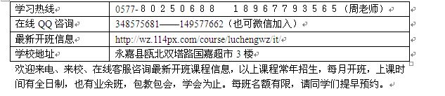 欢迎来电、来校、在线客服咨询最新开班课程信息,以上课程常年招生,每月开班,上课时间有全日制,也有业余班,包教包会,学会为止。每班名额有限,请同学们提早预约。