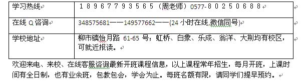 欢迎来电、来校、在线客服咨询最新开班课程信息,以上课程常年招生,每月开班,上课时间有全日制,也有业余班,包教包会,学会为止。每班名额有限,请同学们提早预约。