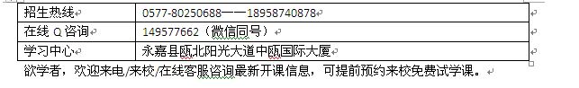 招生热线 0577-80250688——18958740878在线Q咨询 149577662(微信同号)学习中心 永嘉县瓯北阳光大道中瓯国际大厦欢迎来电/来校/在线客服咨询最新开课信息,可提前预约来校免费试学课。...