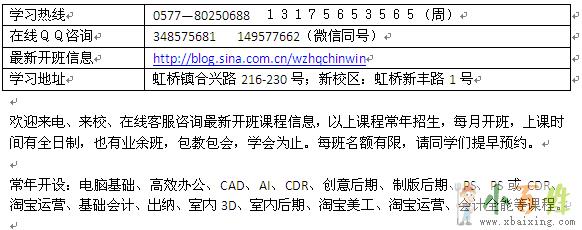 学习热线:0577—80250688 13175653565(周);在线QQ咨询:348575681微信同号;学习地址 虹桥镇合兴路216-230号;新校区:虹桥新丰路1号欢迎来电、来校、在线客服咨询最新开班课程信息,以上课程常年招生,每月开班,上课时间有全日制,也有业余班,包教包会,学会为止。每班名额有限,请同学们提早预约。...