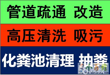 (全城服务 价格优惠)疏通马桶下水道,高压清洗管道,抽粪,清理化粪池,维修水管。1.管道疏通——大中小机械疏通各种疑难下水道、卫生间、地漏、浴缸、菜池、阴沟、马桶、蹲坑等。 2.管道清洗——备有大中高压清洗车--高压清洗。各种上下水管道及各种疑难污水管道、市政管线、居民楼房所有分管、立管、主管管线。 3.抽粪——备有大小抽粪车,较长抽力能达50米,随时为你准备