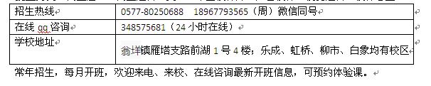 学习热线:0577—80250688 13175653565(周);在线QQ咨询:348575681微信同号;学习地址 虹桥镇合兴路216-230号;新校区:虹桥新丰路1号欢迎来电、来校、在线客服咨询最新开班课程信息,以上课程常年招生,每月开班,上课时间有全日制,也有业余班,包教包会,学会为止。每班名额有限,请同学们提早预约。...
